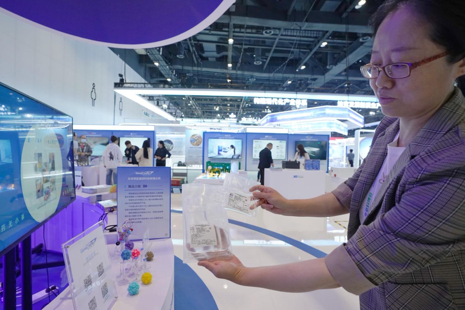 2025年北京科博会上,工作人员向观众展示CAR-T细胞注射液。 王海欣 摄